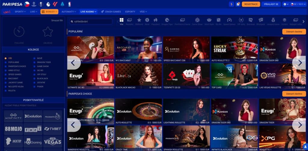 PariPesa casino online v live rozhraní poté nabízí 300+ her od poskytovatelů, jako jsou Vivo Gaming, Super Spade Games, Ezugi nebo LuckyStreak. Hrami provádí profesionální krupiéři a moderátoři s průměrným RTP 98 % a možností vybírat podle variant her, limitu peněz nebo poskytovatele. Mezi podporované hry spadají například: